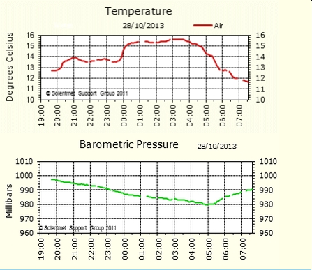But it was at Southampton that the clearest picture emerged.The barometer dropped at over 4mb per hour, indicating gale force winds or more, until the cold front went through at 0500 hrs. Then pressure kicked up and the temperature fell after the front. This picture is so ‘classic’ that it will probably appear in textbooks in the future!