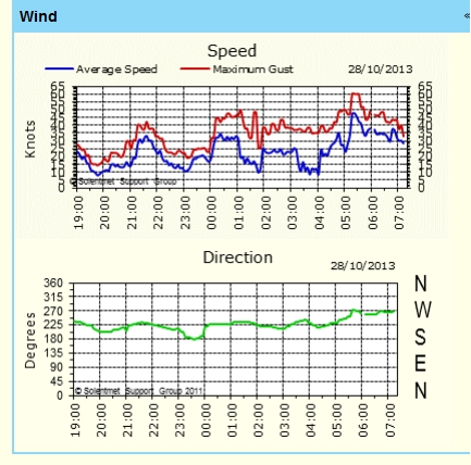 The weather station at the Bramble Bank (below) showed incredible gustiness in the small hours, with average windspeeds of only 10kts, but gusts of 40 Kts.