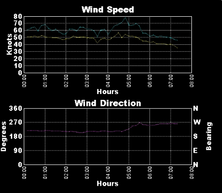 The key point seems to have been at 0500 hrs when The cold front went through. The wind veered from SW to West, and increased to 40 kts gusting to 60kts.