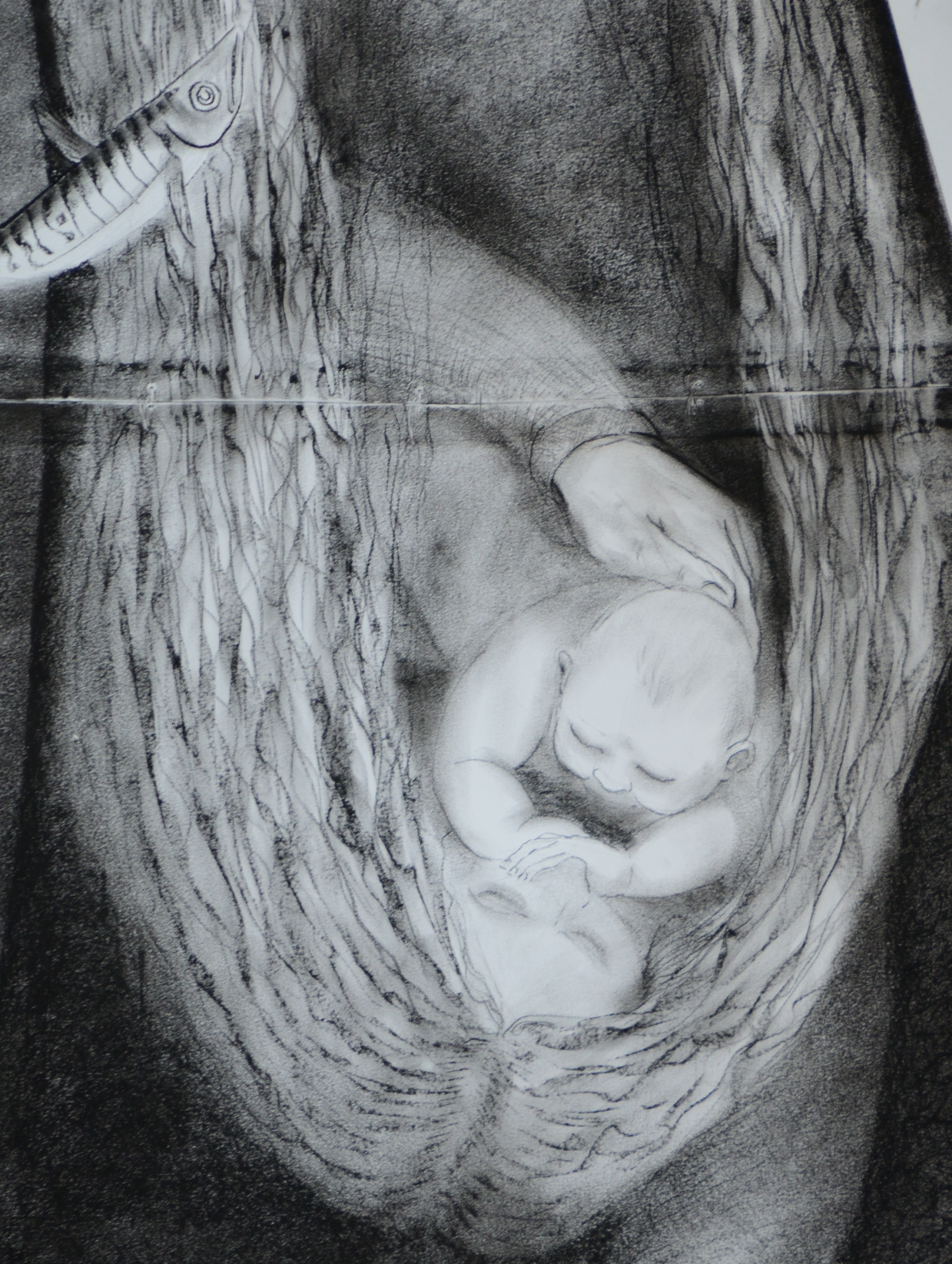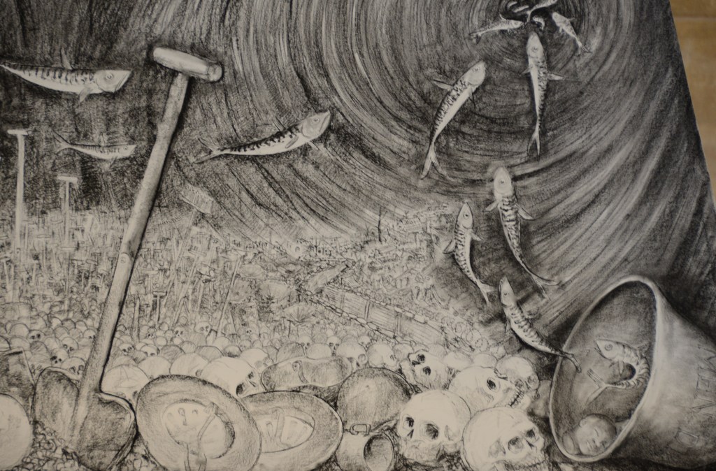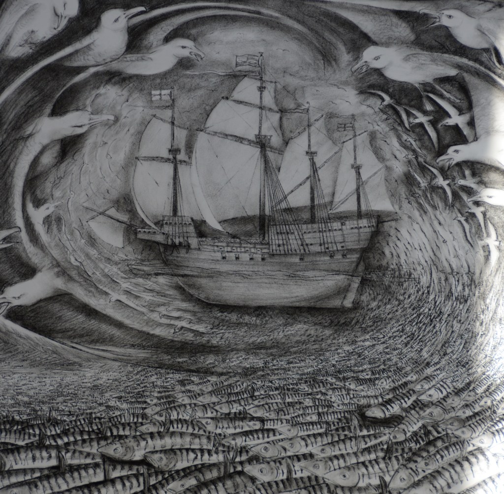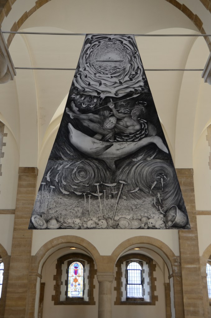 For those with an interest in the maritime history of Portsmouth and the Solent, the current exhibition in Portsmouth’s ‘Cathedral of the Sea’ is well worth a visit. Described by one of our Council members as ‘without doubt, the most moving art installation’ he has ever seen, the work by Pete Codling, artist in residence at Portsmouth Cathedral, is remarkable. Eight massive charcoal drawings hang in the nave, each of the eight panels addressing a separate point in local maritime history. The panels cover loss of life in local waters from the sinking of the Mary Rose to the loss of the SS Mendi and more recently the loss of the crew of the Wilhemina J.
