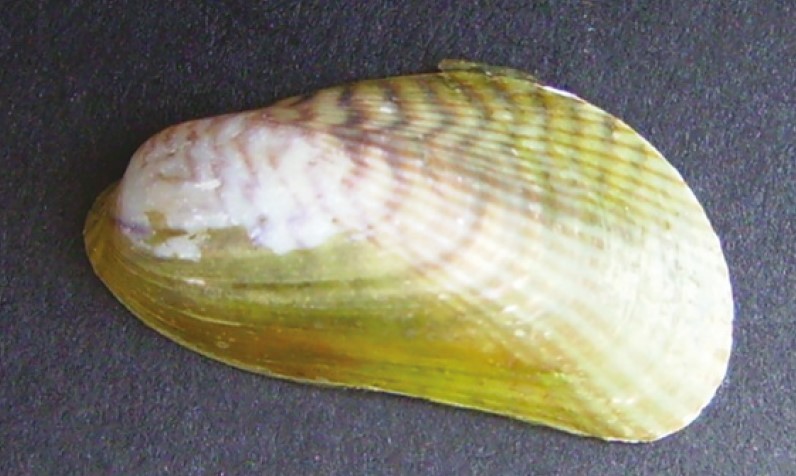 Arcuatula senhousia (Asian date mussel) This mussel is a native of the Pacific Ocean from Siberia to Singapore, but has invaded many other regions of the world. It can live in the intertidal or shallow subtidal zones. It grows quickly and lives for only about 2 years. It prefers soft substrates and surrounds its shell in a dense mass of byssus, the beard-like threads mussels use to attach to rocks etc. This species is considered detrimental to seagrass beds which are important in the Solent region (see article in this issue). In fact, shells had been spotted prior to 2018, but the presence of DNA indicates a living population is certainly in the Solent. Readers should look out for this mollusc when walking our beaches. Barfield et al (2018) reported shells of Asian date mussel on Solent beaches.
