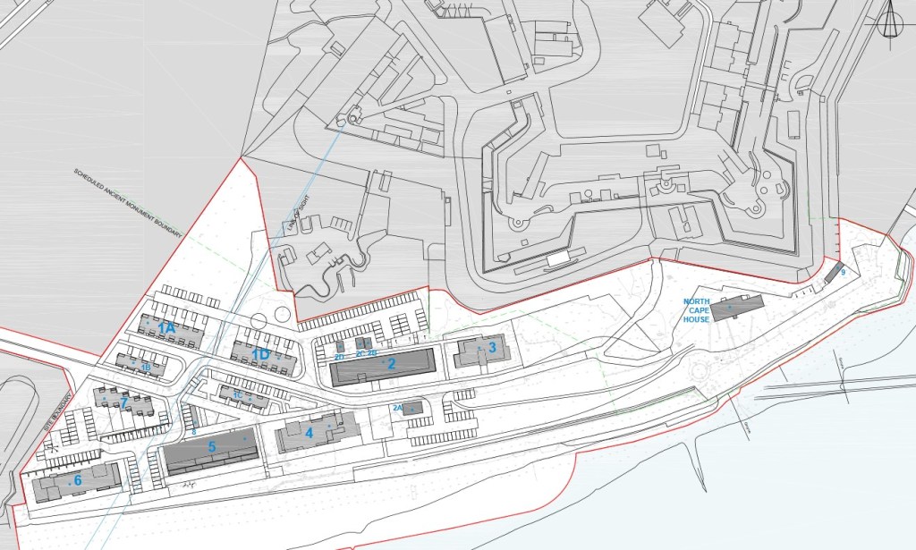 The plans show five significant buildings immediately fronting the sea, two of which (Building 2 and Building 5) are redevelopment of existing structures, while Buildings 3, 4 and 6 are completely new developments.