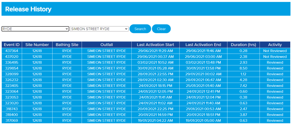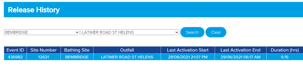 Further down the Beachbuoy page, the history of recorded spills from each individual outfall can be selected based on the initial selection of a ‘bathing beach’. The left hand selection field gives an alphabetic list of ‘bathing beaches’ while the right hand selection box shows the combined sewer outfalls which correspond to the selected bathing beach.