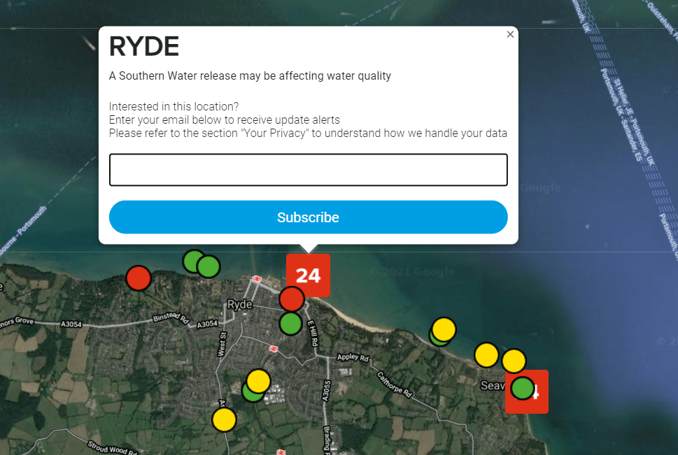 In this example, we have zoomed in on Ryde, which is showing that there has been a ‘Release with the last 24 hours’. Clicking on the red icon brings up the detail in the image below. Each of the local outfalls that might be affecting bathing water quality at Ryde are displayed with either a red, amber or green status and hovering over each outfall icon will display its identifying name. Above the main icon, an input box allows entry of your email address if you wish to be notified of future alerts affecting the bathing beach selected.