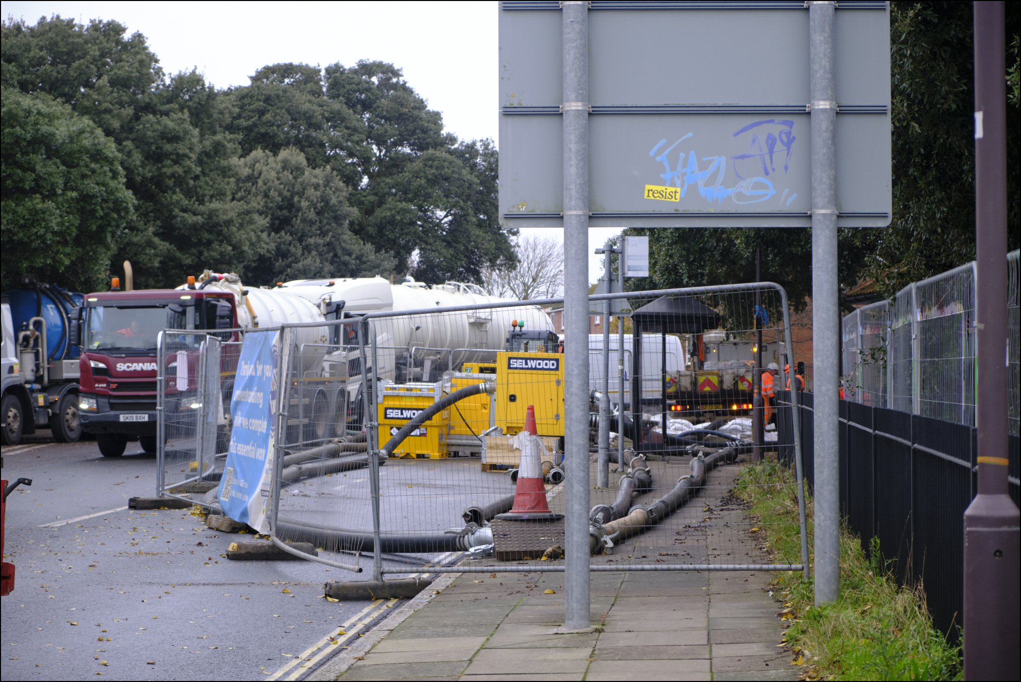 After many months of closure during 2022 and 2023, Pembroke Road, a major through route between Southsea and Old Portsmouth, is once again closed to traffic for the works and for use as a parking lot for the road tankers needed to transfer the effluent off Portsea Island to Budds Farm and/or Peel Common waste water treatment works. The QR code on the Southern Water notice takes the reader to the usual less-than-helpful announcement.