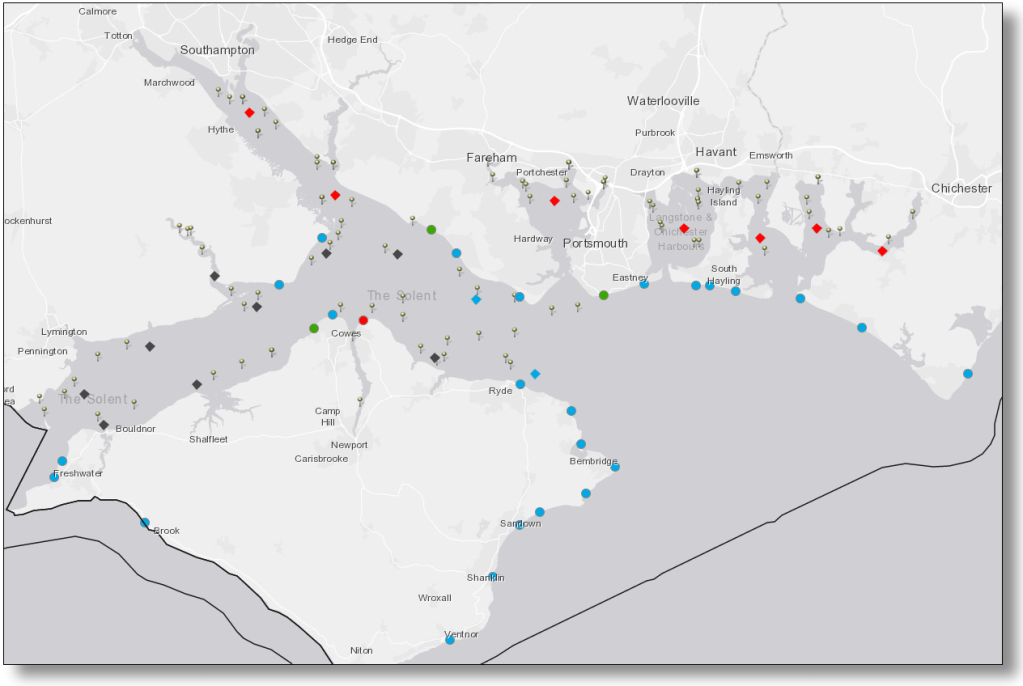 Maps in this section include drinking water protected areas, nitrate vulnerable zones, urban waste water treatment sensitive areas and bathing water protected areas. The example below shows bathing water and shellfish water protected areas around the Solent.